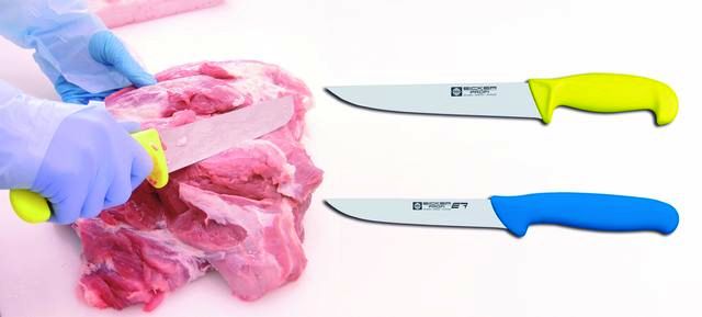 La nuova gamma di coltelli Tecnafood è studiata per la lavorazione della carne, in particolare per usi intensivi. Per soddisfare le diverse esigenze sono state create due serie differenti: E7, progettata per le operazioni di disossamento; Profi, che racchiude le diverse tipologie di coltelli, come quelli da macello, per volatili, per scuoiatura, per filettare eccetera. Entrambe le serie sono costruite con acciaio tedesco a finitura lucida, e hanno impresso sulla lama un codice per la rintracciabilità. Il filo della lama garantisce una lunga durata. L’impugnatura ha il massimo grip sia con mani sia con guanti bagnati. E7 si differenzia da Profi nel manico, studiato per le operazioni di disosso. Infatti non presenta le estremità accentuate classiche dei coltelli da macellazione, ma ha una forma più ergonomica che facilita la presa evitando fastidi alle mani anche dopo molte ore di lavoro. La serie ha invece un manico con una forma più decisa, per permettere di imprimere maggiore forza e garantire una presa più salda durante le operazioni di taglio.
