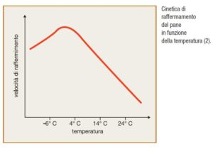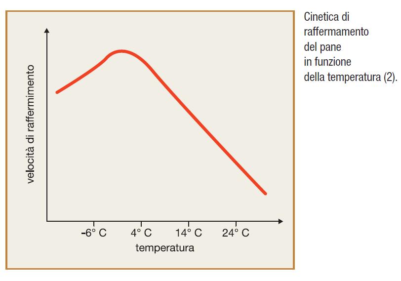 I primi due fenomeni sono dovuti alla ridistribuzione dell’umidità del prodotto, che subito dopo la cottura è massima al cuore e minima sulla crosta: la percezione sensoriale di “prodotto fresco” è strettamente correlata al contenuto di umidità interno. La maggiore tendenza allo sbriciolamento, e in parte anche l’indurimento, sono poi dovuti al fenomeno di retrogradazione dell’amido. Tale fenomeno si può considerare come l’inverso della gelatinizzazione e consiste nella tendenza da parte dell’amido a riassumere la struttura originaria per entrambi i suoi componenti ovvero amilosio e amilopectina. L’amilopectina, inizialmente cristallina, passa allo stato amorfo plasticizzato durante la cottura; in seguito, sebbene non riesca mai a tornare in una configurazione cristallizzata identica a quella iniziale, si riorganizza in strutture elicoidali rigide. Alla rigidità della struttura contribuiscono anche i cristalli di amilosio che si riformano, dopo essersi solubilizzati durante la cottura. La retrogradazione non solo è alla base del raffermamento dei prodotti da forno e quindi del loro scadimento qualitativo, ma causa anche una perdita di digeribilità dei prodotti stessi. Anche l’interazione tra amido e proteine del glutine gioca un ruolo nel raffermamento del pane. Infine, la perdita di aromi caratteristici è dovuta sia alla loro volatilizzazione (in funzione di tempo e temperatura di conservazione e tipo di packaging) che a fenomeni degradativi in particolare di natura ossidativa. Influenza della temperatura sul raffermamento. È noto come le basse temperature favoriscano il raffermamento dei prodotti da forno, peggiorandone quindi la shelf life non dal punto di vista microbiologico bensì dal punto di vista qualitativo.