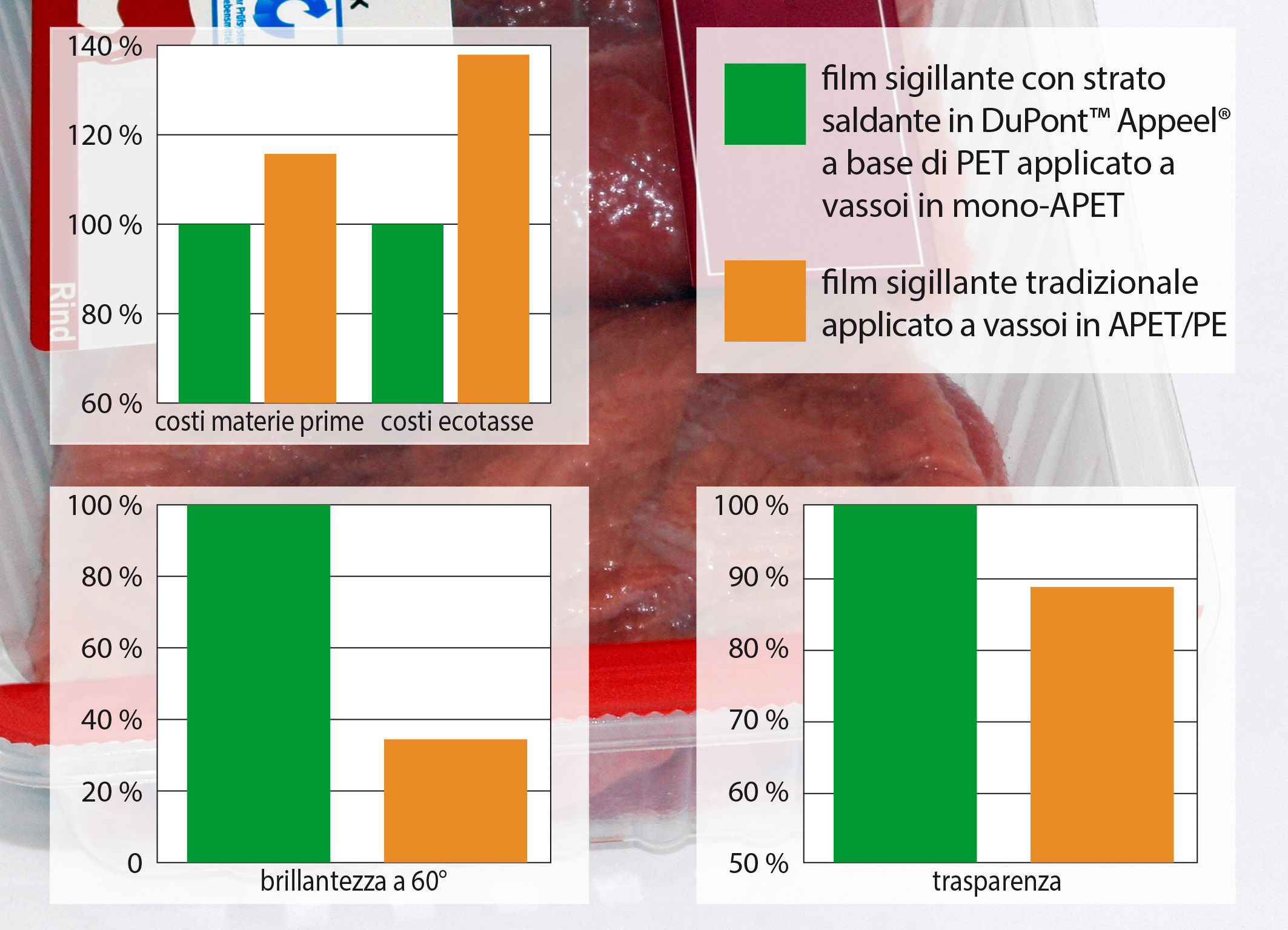 DuPont e Reifenhäuser hanno sviluppato una struttura molto economica con uno strato saldante in resina Appeel® a base di PET, in grado di aderire direttamente alle vaschette in mono-APET. Tra i vantaggi rispetto ai film saldanti tradizionali con strato saldante in LDPE, figurano un migliore effetto barriera ai grassi, una maggiore resistenza alla perforazione, una brillantezza superiore e ottima trasparenza. Eliminando la necessità di applicare uno strato aggiuntivo in resina poliolefinica accoppiato alle vaschette in APET, la nuova struttura saldante consente risparmi significativi in termini di materie prime ed ecotasse, nonché una riduzione delle emissioni di gas serra.