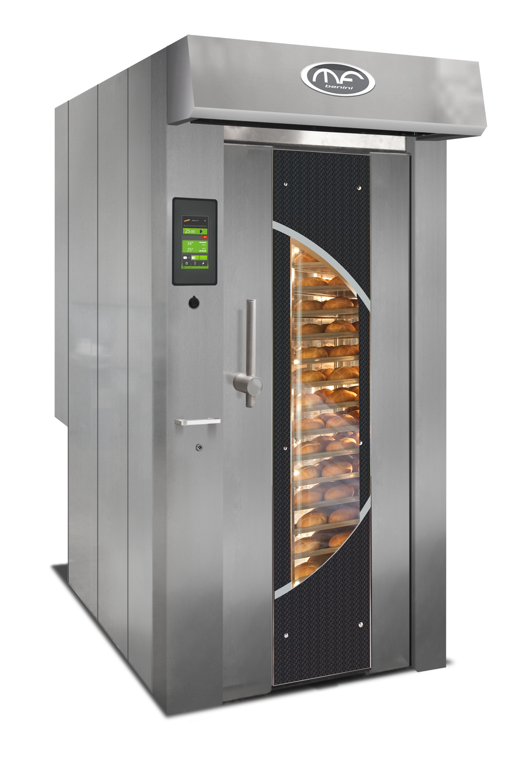 La foto mostra un nuovo modello: il forno rotativo Basic 3.0 con centralina touch intuitiva e speciali sistemi di regolazione dei flussi d’aria. Grazie alla sua capacità di gestire repentini cambi di temperatura, questo forno si distingue per versatilità. Il flusso d’aria ascendente BTT (Bottom to Top) permette cotture con finitura artigianale.
