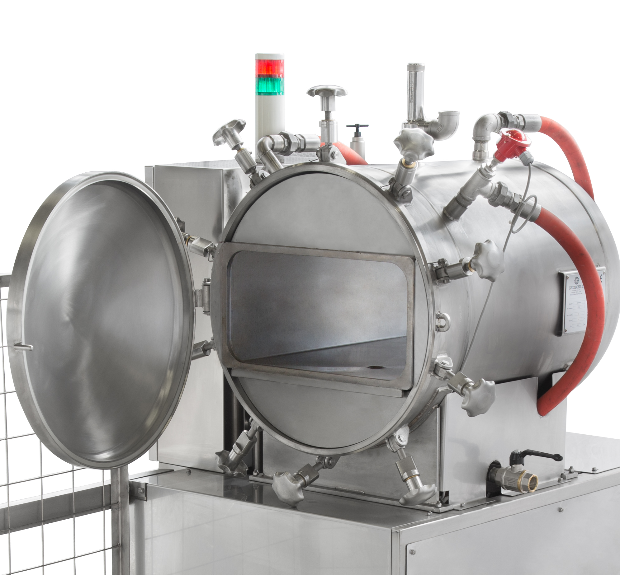 Inoltre, la fase di raffreddamento avviene in circa 60 minuti rispetto alla durata di 15/20 ore di quella tradizionale all’aria. La foto mostra il modello NGA, compatto e di forma cilindrica, con vano separatore dei cesti di prodotto da trattare. Lo scambio di calore avviene attraverso la combinazione di riscaldamento e raffreddamento indiretto, che consente una circolazione separata per vapore e acqua di raffreddamento senza contatto e quindi senza rischi di contaminazione.