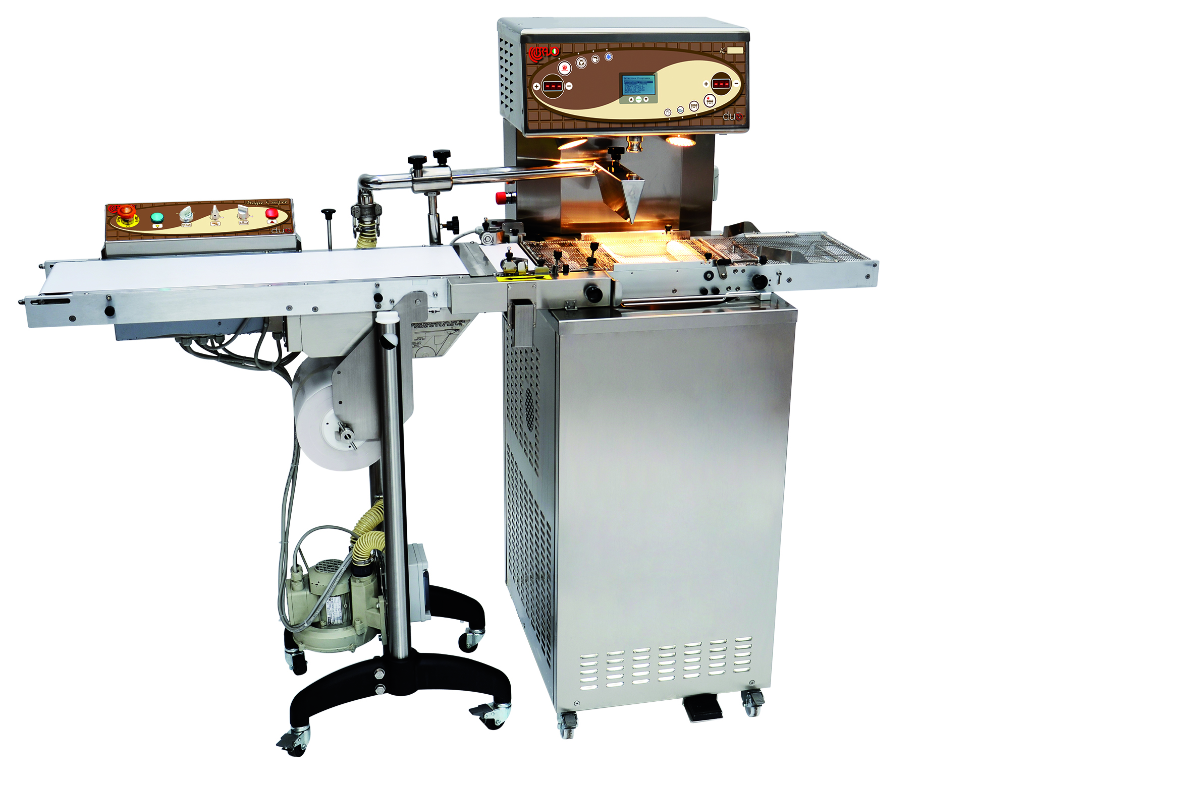 La zona di ricopertura è dotata di un flusso d’aria regolabile che permette di far sgocciolare il cioccolato in eccesso. Per lo stesso scopo anche il sistema di vibrazione è regolabile in intensità. Il nastro può anche invertire la marcia per la produzione di praline e tartufi.