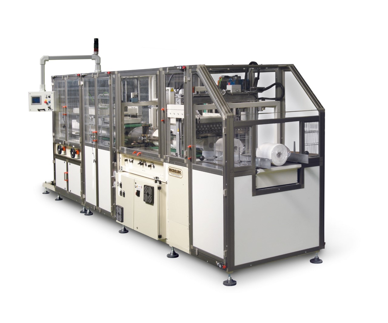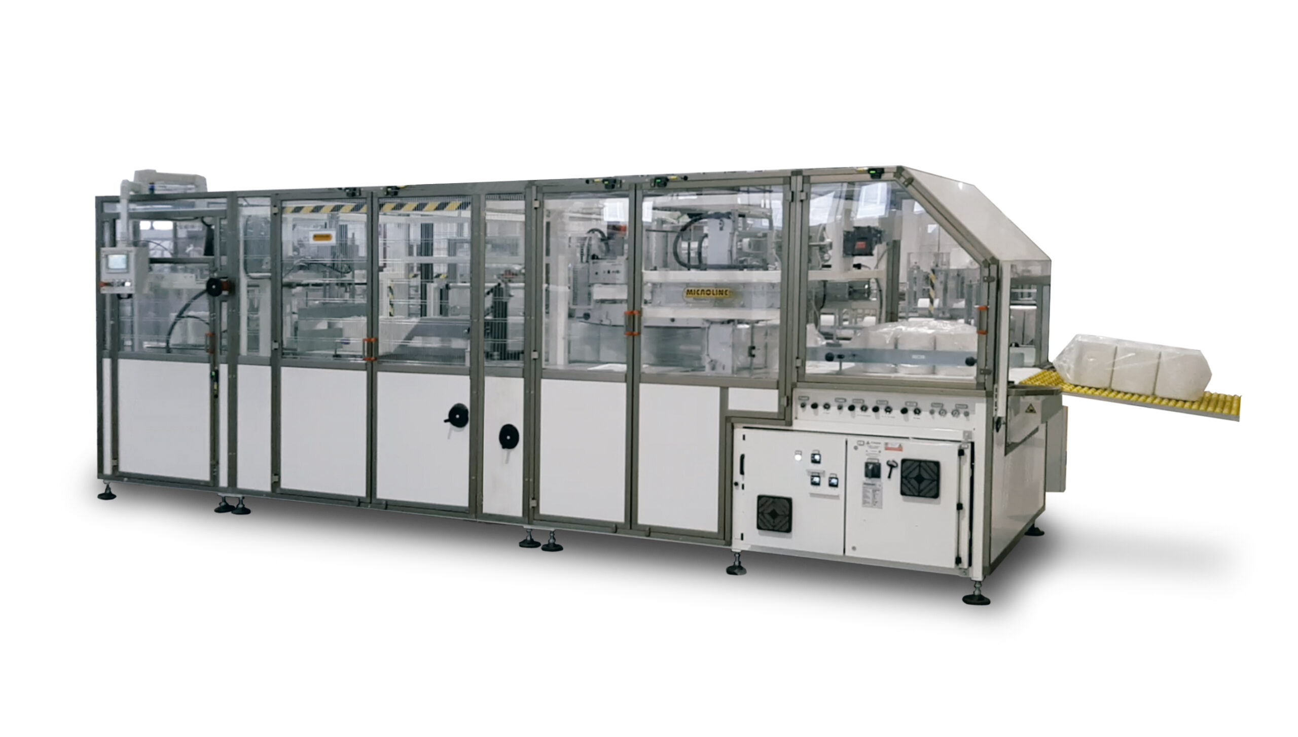 Il sistema allestito presso il polo produttivo di Roto – cart integra in sé i concetti portanti della produzione Microline, tesa a coniugare eccellenti livelli di performance, elevate caratteristiche di robustezza e grande flessibilità. La linea viene impiegata per il confezionamento e insaccamento ad alta velocità di tre tipologie di prodotti, con forme e caratteristiche differenti: rotoli di tipo AFH per uso industriale, lenzuolini medicali e carta igienica.