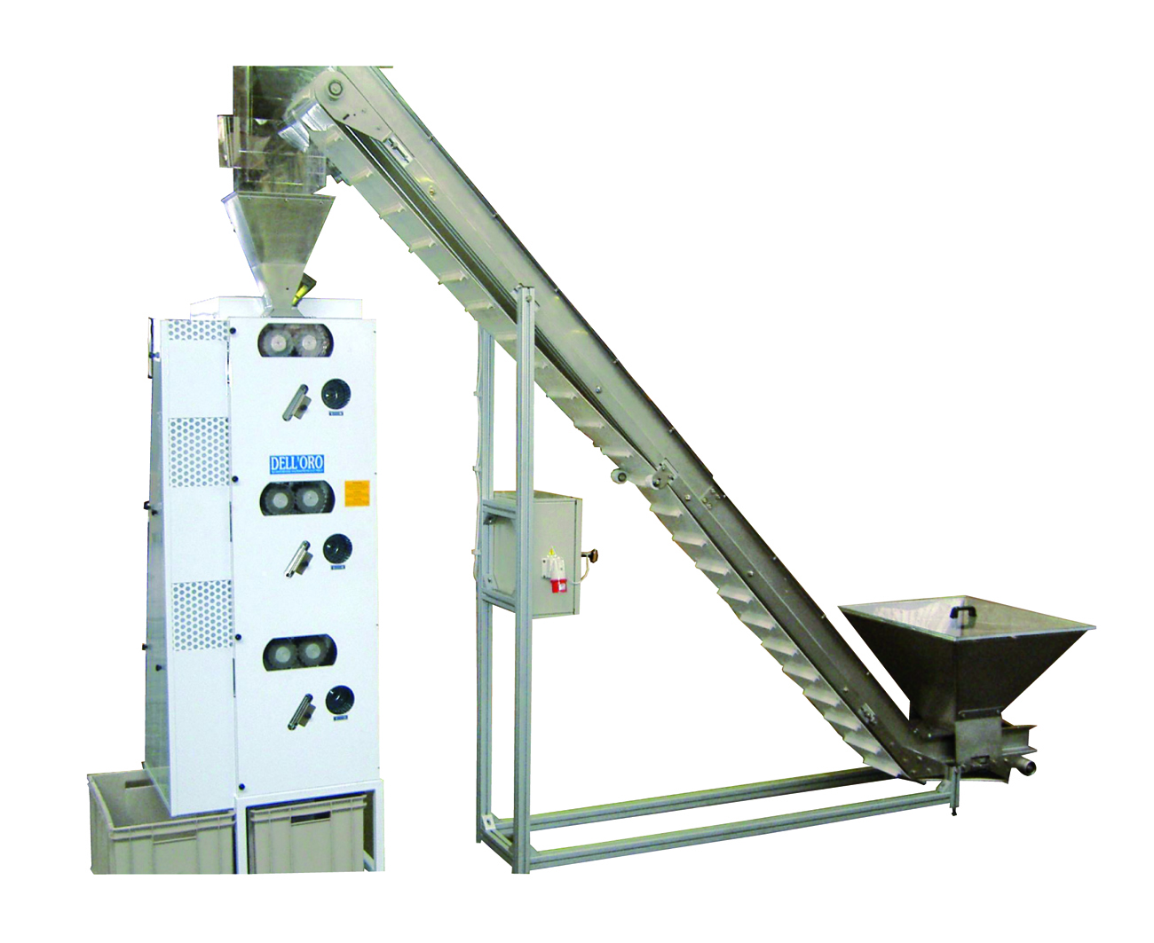 Il nastro alimenta in continuo lo sbuccia mandorle automatico, il quale è composto da tre stazioni di pelatura con sei cilindri di gomma dentata morbida, regolabili, che girano a velocità differenziata. Con un solo caricamento, le mandorle possono subire tre lavorazioni per gravità. Tre ventilatori provvedono a separare le bucce dai frutti.