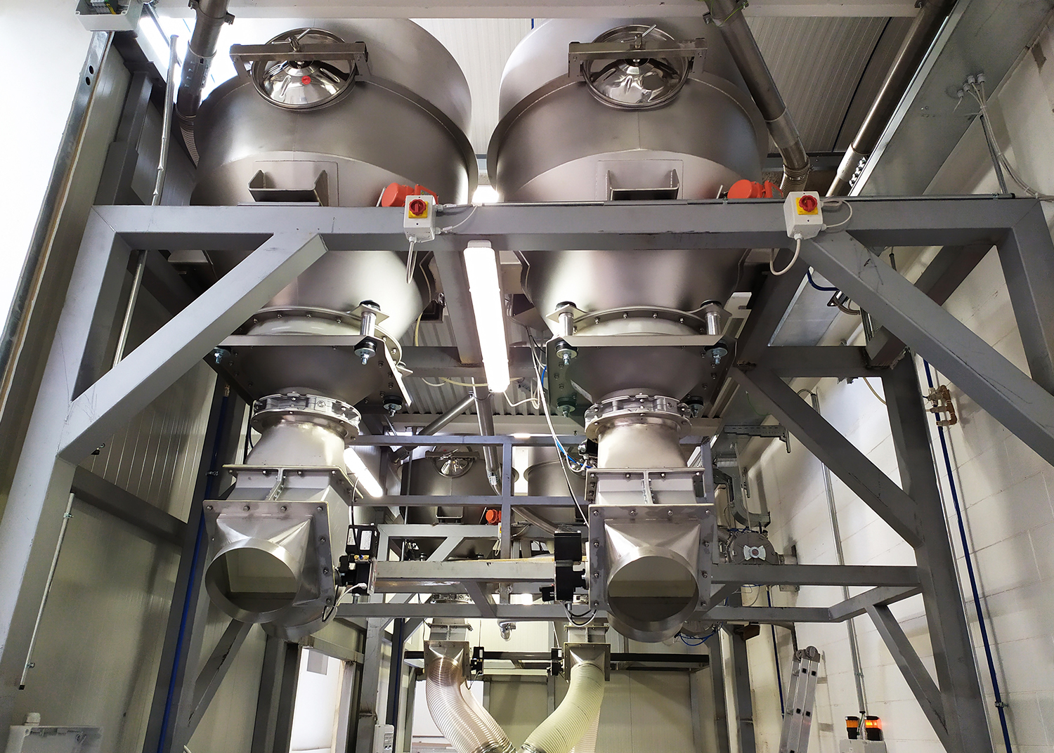 La configurazione dell’impianto prevede quattro stazioni svuota big-bag, ciascuna con dispositivi di dosaggio e quattro tramogge polmone installate sulla verticale dei miscelatori.