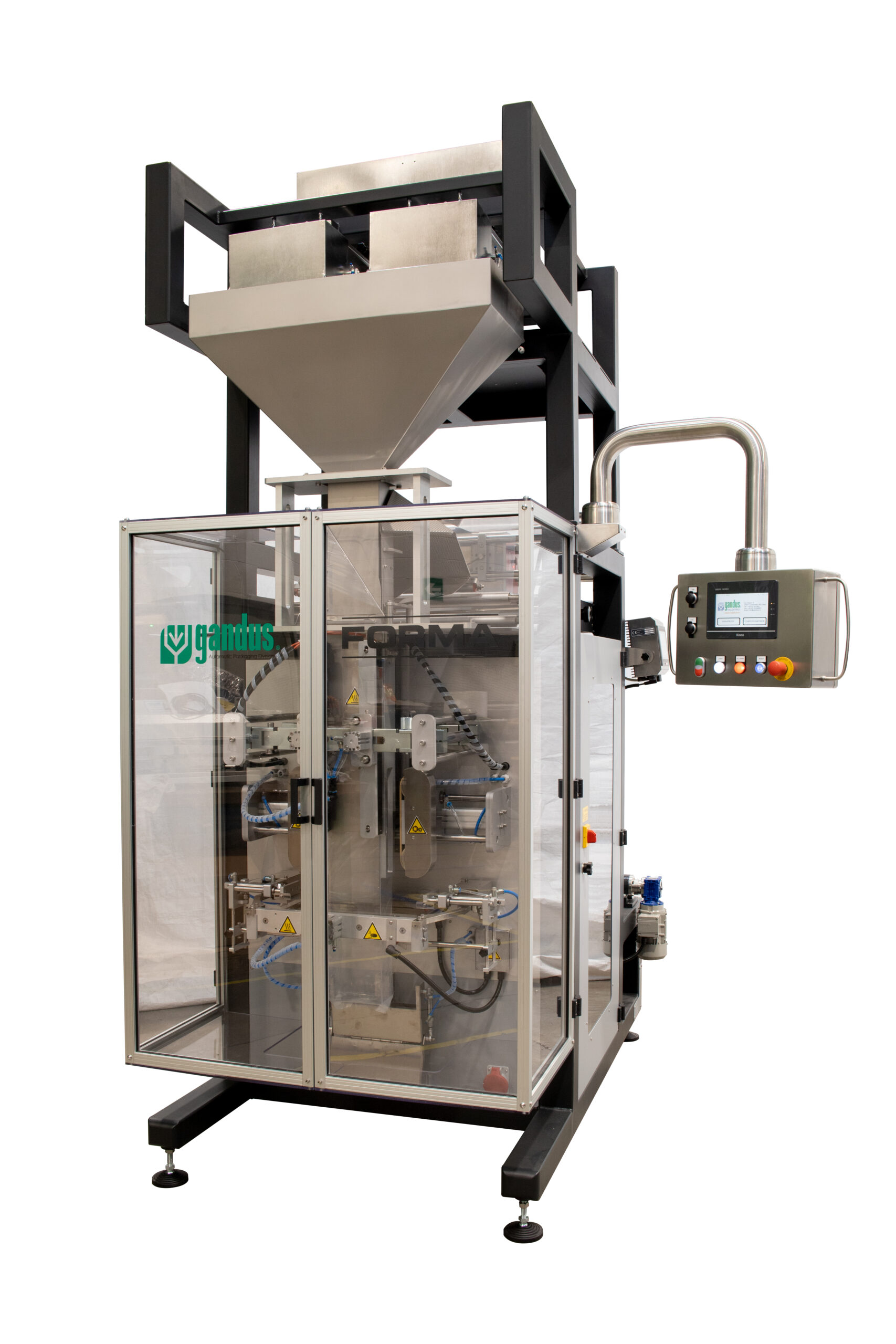 Partendo da bobina di film termosaldante, Forma permette di realizzare confezioni Stabilo a quattro saldature e buste a cuscino e a fondo quadro ermetiche a tre saldature. Realizzata da Gandus, questa confezionatrice verticale FFS è ideale per molteplici alimenti (caffè, biscotti, caramelle, snack, prodotti da forno, pasta, riso, cioccolato e prodotti in polvere in generale).