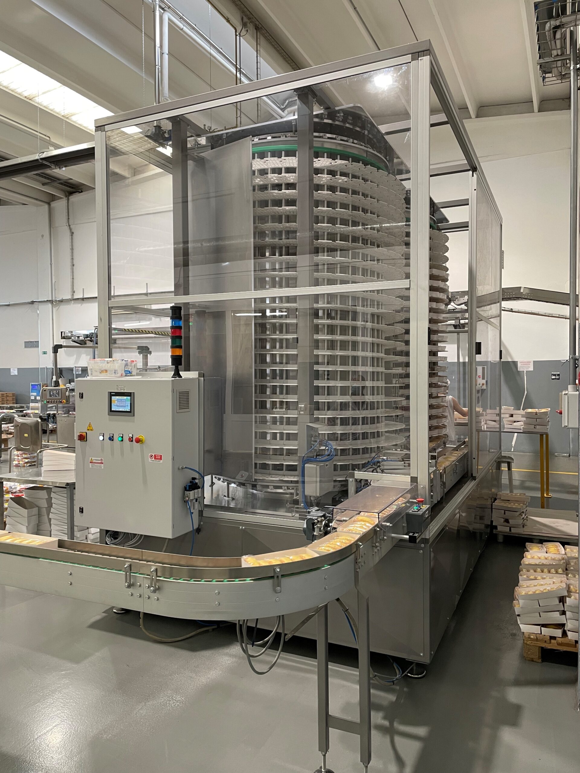 Per gestire le micro-fermate della flowpack di sovraimballo, dell’incassatrice e del pallettizzatore, si posiziona dopo l’invassoiatrice un sistema l’Heliflex, a doppia spirale. Il motivo per cui si mettono due sistemi di accumulo è per non mandare sotto stress il sistema, che si troverebbe a lavorare sempre nel caso in cui dovesse gestire tutte le fermate di una linea con così tanti livelli di confezionamento.