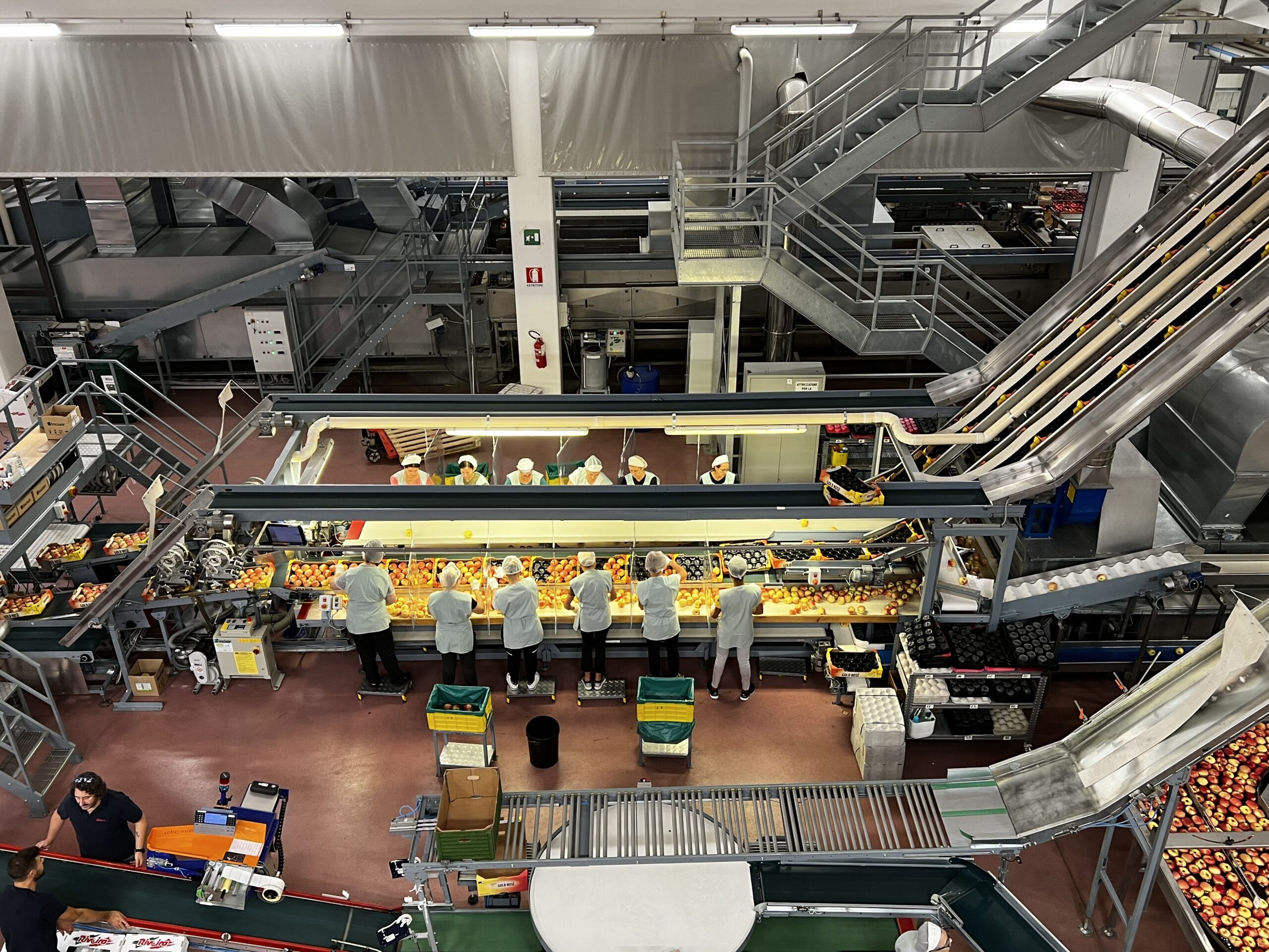 Nella sua sede di Verzuolo (CN) le mele vengono controllate e smistate nei diversi magazzini di conservazione. La parte di raccolto destinata alla conservazione a lungo termine viene stoccata in celle frigorifere ad atmosfera controllata, all’interno delle quali l’ossigeno viene portato a circa l’l% e la temperatura mantenuta a circa 0-2°C.