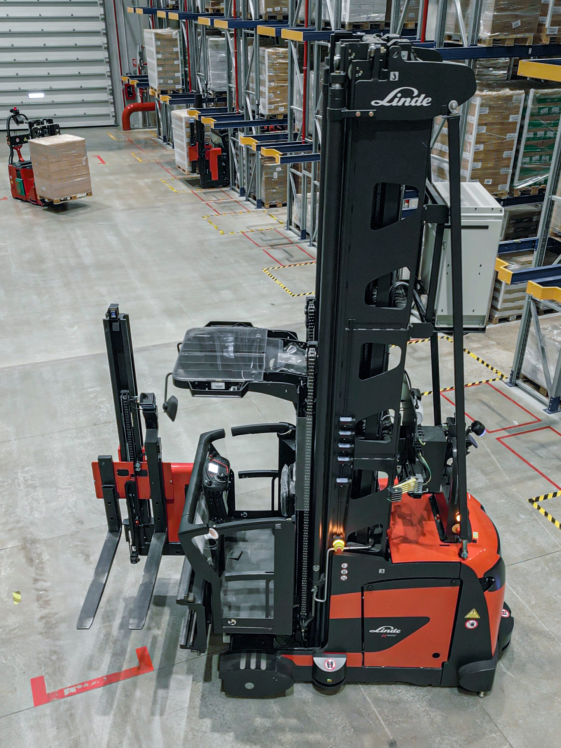 Le scaffalature ad alta densità, organizzate in dieci corsie distinte, prevedono sei livelli di stoccaggio per una capienza totale di 4600 posti pallet che ospitano 588 referenze. Qui operano i carrelli automatici L-Matic AC, con capacità complessiva di 39 pallet/h, e due K-Matic per le aree dove gli operatori non hanno accesso. Grazie al sistema di geo-navigazione integrato i carrelli possono agire in autonomia, senza l’ausilio di sistemi e sensori esterni per la guida da remoto.