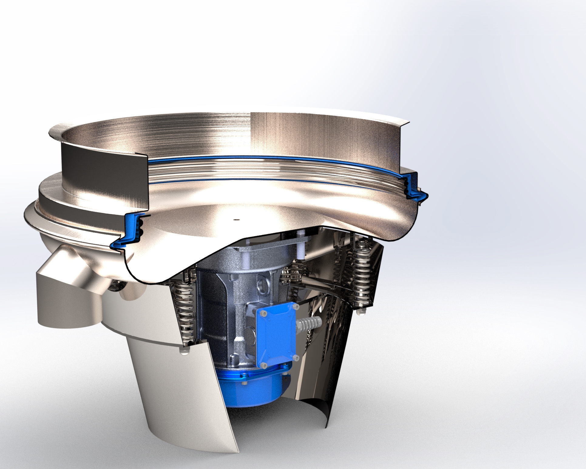 La macchina è completa di guarnizioni di silicone platinico e ha un sistema di tensionamento della rete che funziona per mezzo di anellini tenditori, il quale assicura la completa autonomia nel cambio della rete. Il disco di base a doppia bombatura, facilmente pulibile grazie all’assenza di ristagni e spigoli vivi, e il motovibratore studiato appositamente per questo modello, garantiscono le massime prestazioni di setacciatura grazie anche alla ridotta distanza dalla rete.
