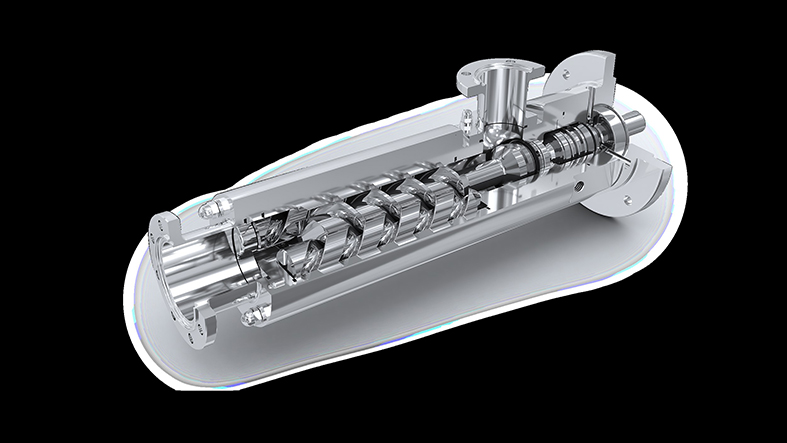 La foto mostra un particolare di Hyper³, la prima pompa a tre mandrini al mondo per applicazioni igieniche che raggiunge un’efficienza volumetrica del 96%. La presenza delle tre viti e il design con tolleranze ridotte consente di ridurre l’effetto back flow, rendendo la pompa perfetta per il dosaggio di liquidi anche poco viscosi.
