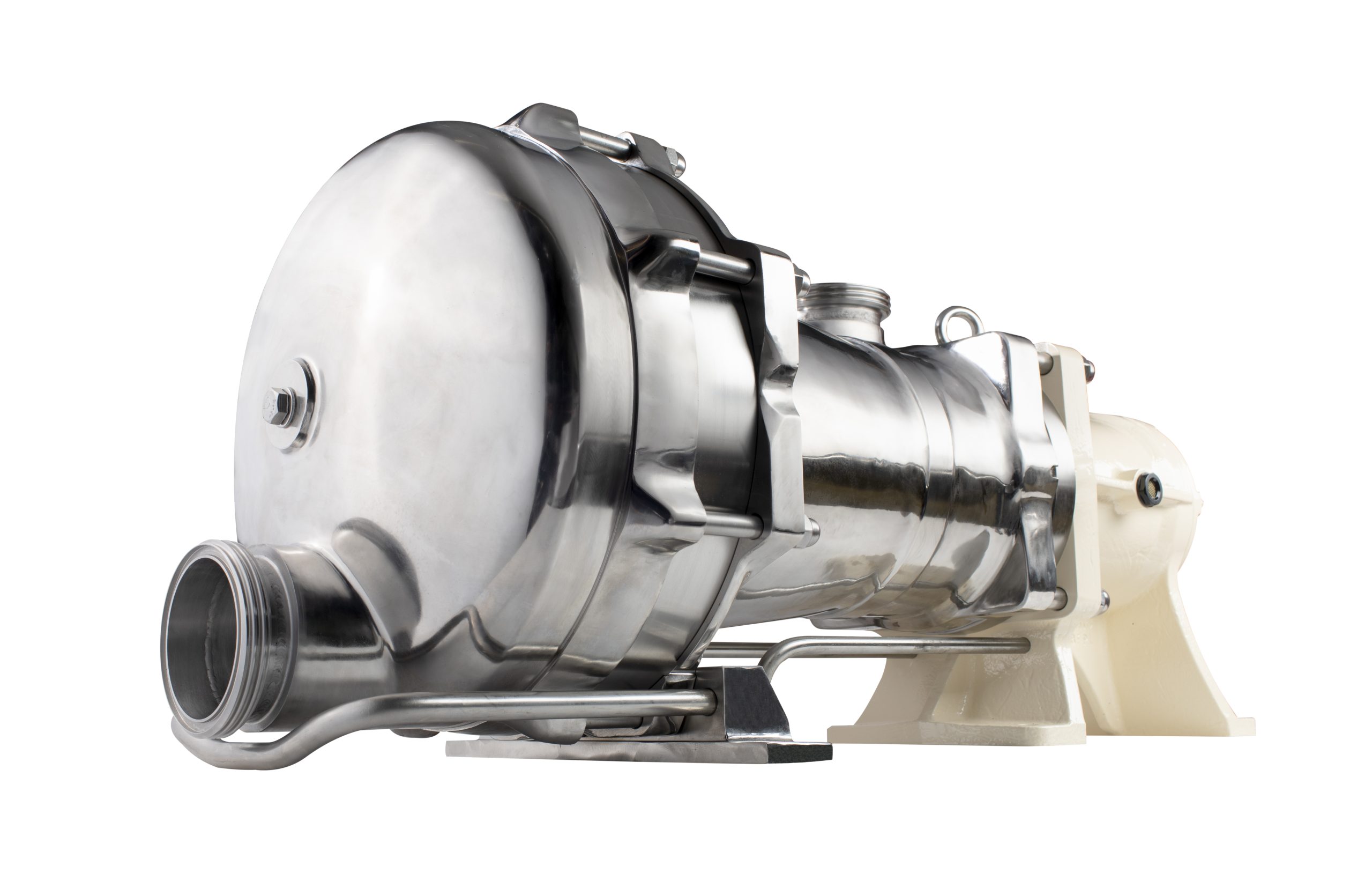 La foto mostra un modello della gamma di pompe H-Flo, basata sulla tecnologia a disco eccentrico inventata appunto da Mouvex, senza tenute e rispettosa degli standard igienici CE 1935-2004, FDA, EHEDG.