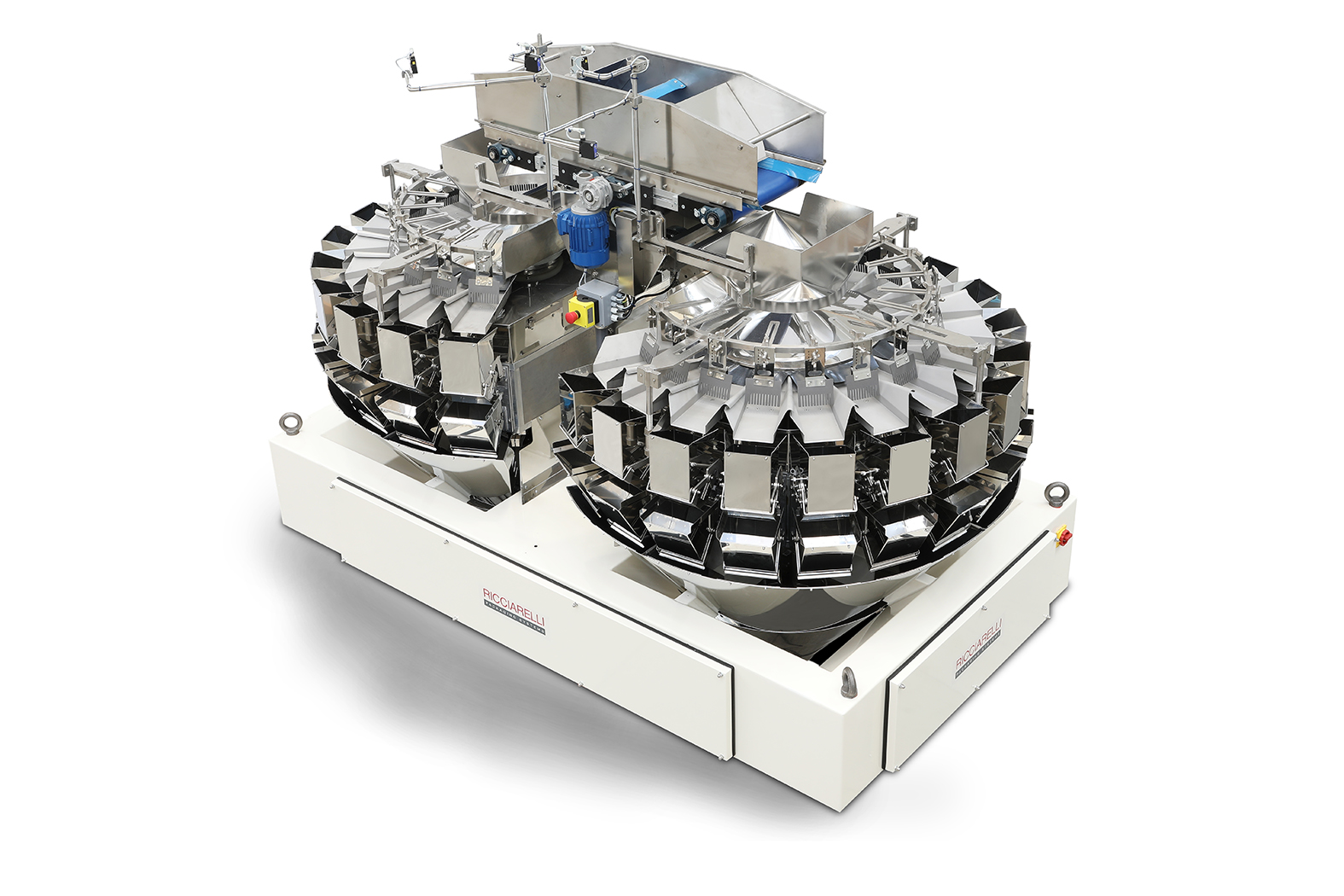 La pesatrice multitesta FCBS28TW di Ricciarelli è costituita da due settori completamente indipendenti, formati da 14+14 teste comandate da motori passo-passo disposte a raggera con due coni di scarico per alimentare confezionatrici twin o astucciatrici con due punti di carico.